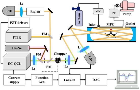 The EC-QCL was used in combination with a multipass cell (AMAC-76, Aerodyne Inc., Billerica, MA, USA) with an effective length of 76 m, as shown in Figure 3. The mirrors of the multipass cell (MPC) were coated for optimal reflection (reflectivity ~99.2%) between 3–12 µm. Two lenses L1 (f = 24 cm, ZnSe) and L3 (f = 35 cm, ZnSe) were used to match the waist of the beam to the middle of the MPC. The laser beam exiting the MPC was focused onto an infrared detector (PD1, PVI-4TE-10.6, Vigo Systems, Ożarów Mazowiecki, Poland). A lock-in amplifier (Stanford Research Systems, Sunnyvale, CA, USA) was used to demodulate the signal from the detector. The demodulated signal was recorded via a data acquisition card (NI PCI-6259, Austin, TX, USA) and a LabVIEW program for further analysis.