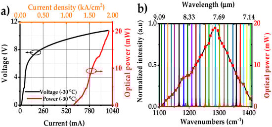 (a) L-I-V curves of the EC-QCL; (b) normalized FTIR spectral tuning coverage of EC-QCL with corresponding output powers at −30 °C. The total scanning range is over 300 cm−1 with a maximum output power of 20 mW.