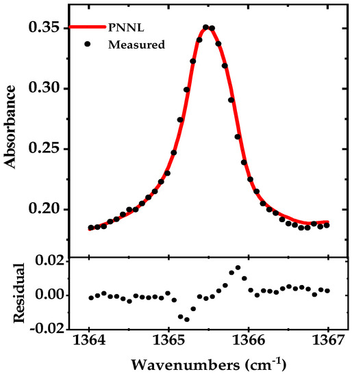Narrowband absorption spectrum of the acetone Q-branch (~1365.5 cm−1) in black (100 mbar pressure, optical path length of 76 m), measured in 40 ms and averaged for five times compared to simulated absorption spectrum from the PNNL 2014 database in red. The residual is shown in the lower panel.
