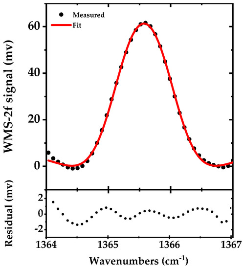 The WMS-2f signal of the acetone Q-branch (~1365.5 cm−1) in black (measured in 40 ms and averaged for five times), from 50 ppmv of acetone in N2 at 100 mbar pressure along with a fit of a simulated WMS-2f signal in red. The lower panel shows the difference between the measurement and simulation.