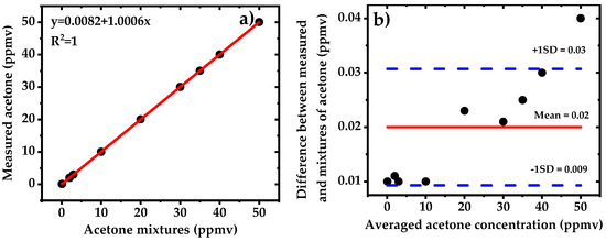 (a) Linearity of the WMS-2f setup. Measured acetone concentrations against the prepared dilutions of the calibrated mixtures of 50 ppmv in N2; (b) Bland–Altman plot showing the residual for 9 acetone mixtures. The solid red line represents the mean difference between the measured and applied acetone mixtures while blue dashed lines indicate the standard deviations.