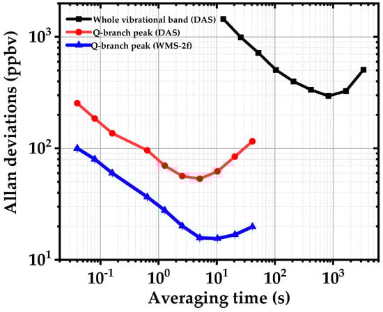 To evaluate the detection limit, stability and precision of the spectrometer for acetone detection, we calculate the Allan–Werle deviation for scanned DAS and WMS-2f, as shown in Figure 9. The noise-equivalent absorption sensitivity (NEAS) per measurement data point of our EC-QCL is calculated for each method by [26],