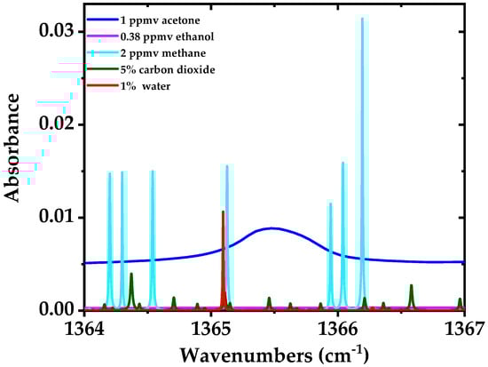 Simulated spectra of 1 ppmv of acetone (blue), 1% of H2O (red), 0.38 ppmv of ethanol (magenta), 5% of CO2 (green), and 2 ppmv of methane (cyan) in the spectral region from 1364–1367 cm−1 with an optical path length of 76 m, room temperature of 298 K and 100 mbar pressure [44,56].
