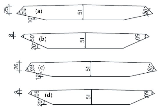 Sectional model diagrams of four closed-box girder sections (unit: cm): (a) Section with α = 50° and β = 10°; (b) Section with α = 50° and β = 20°; (c) Section with α = 60° and β = 10°; (d) Section with α = 60° and β = 20°.