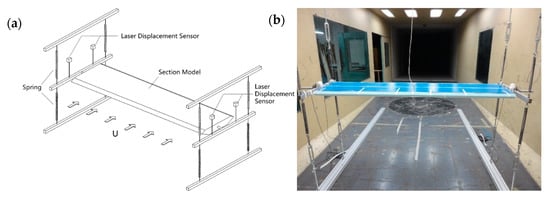 Experimental diagrams for flutter tests and VIV tests: (a) Setup; (b) Sectional models of flutter tests.