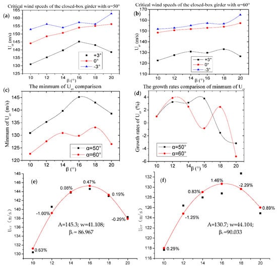 Besides, the critical flutter wind speeds for closed-box girders with different wind fairing angles and inclined web angles can be fitted using a Sine function, as shown in Equation (1) and Figure 4e,f. It can be seen that the results of a Sine function agree reasonably well with the change in Ucr for closed-box girders with various geometrical configurations.