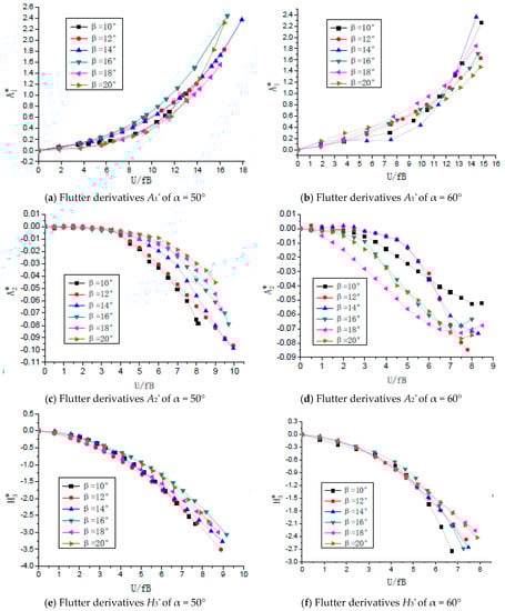 As shown in Figure 5, the typical flutter derivatives of the closed-box girders with various geometrical configurations were calculated and three important derivatives including A1*, A2*, and H3* under the most unfavorable wind attack angle of +3° were compared [22]. All of the values of the derivatives A1* were positive and gradually increased with the increase of the reduced wind speed (U/fB). All of the values of A2* were negative for all reduced wind speeds and the absolute values of A2* increased as β increased in the case of α = 50°, which is different from those when α = 60°. In general, the absolute values of H3* become larger as the reduced wind speed increases or the inclined web angle β decreases, and all values of H3* were also negative when α = 50° and 60°.