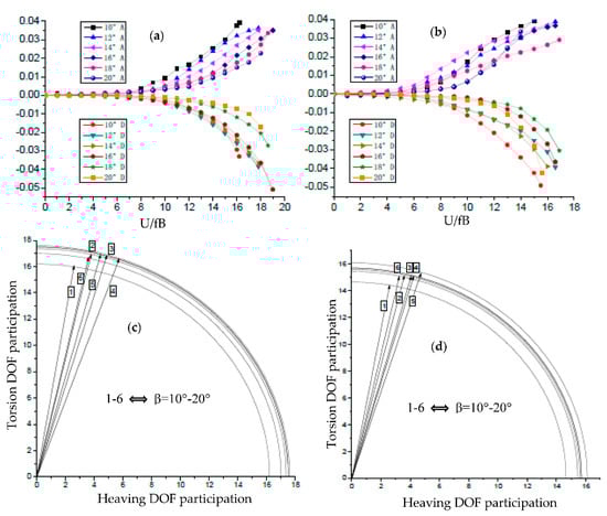 It can be seen that Part A (with a reference of A2*) increased in the positive region with the increase of the reduced wind speed, while Part A significantly decreased with the increase of β when α = 50°. Therefore, Part A makes the greatest contribution to aerodynamic stability. However, Part D (with a reference of A1*H3*) was negative and decreased with the increase of the reduced wind speed, and so exhibits the worst influence on aerodynamic stability. The absolute values of Parts A and D continued to decrease with the increase of inclined angles of webs. As illustrated in Figure 6c,d, the participation levels of torsion motion of the closed-box girders were considerably high and the distribution of the flutter modality vectors were concentrated. This implies that the coupling flutters are given priority to torsional motions. Moreover, the influence of lower inclined webs in flutter modality can be clearly seen as the participation level of heaving degrees of freedom DOF in the torsion-dominated coupled flutter initially increased, reached its peak, and then decreased with the increase of β. A higher participation level of heaving DOF at the flutter critical condition always leads to a better flutter performance.