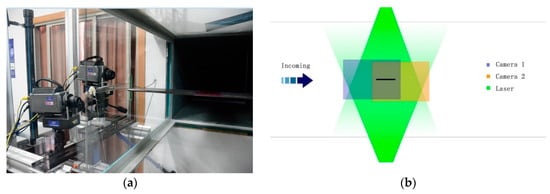 In order to reflect the high-resolution three-dimensional flow structures around the bridge deck, two digital CCD cameras and a dual Nd:YAG laser were set outside the working section (which is 0.8 m wide, 0.8 m high, and 5 m long) in Tongji University’s TJ-4 wind tunnel with the maximum wind velocity of 30 m/s, as shown in Figure 7a. Two digital CCD cameras were able to simultaneously capture the region around the sectional models and the slotted parts through the double frame, using the double exposure method, as described in in Figure 7b. The complete flow fields were stitched together by two images of the feasible flow field regions of each camera with the sampling frequency of 200 Hz. The velocity maps were obtained using FFT (Fast Fourier Transform) based on the cross-correlation method in two sequential frames overlapping 50% in each direction with an interrogating window of 64 × 64 pixels. It should be noted that the ratio of the geometric scale is 1:140 and the ratio of the wind speed scale for flutter testing is 1:13.