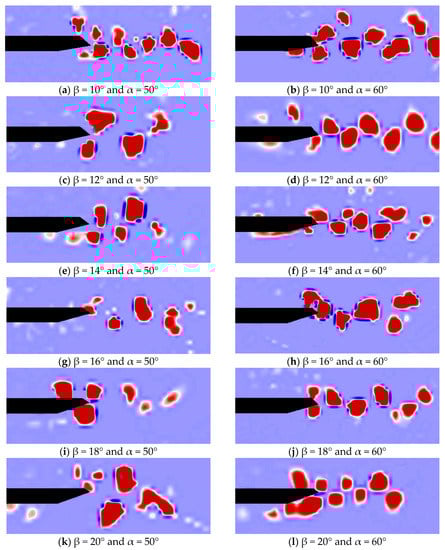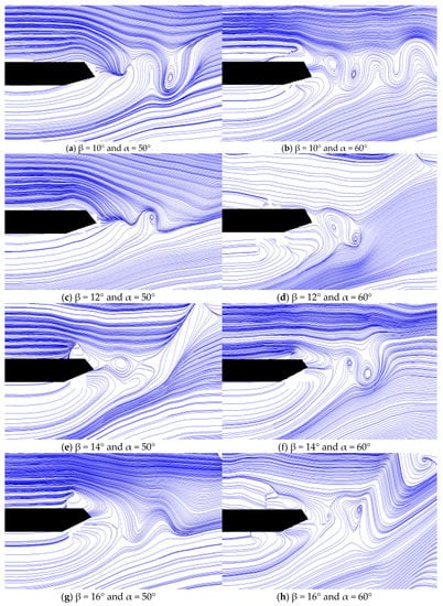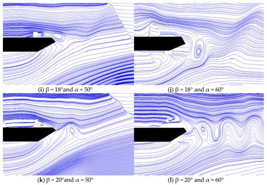 Streamline maps of velocity vector both for α = 50° and α = 60°: (a–l) β = 10°, 10°, 12°, 14°, 16°, 18°, 20°, respectively.