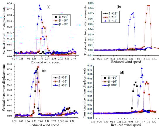 Figure 10 shows that there are no VIV responses of the closed-box girders observed when β = 14° and α = 50°. However, the girders encountered visible heaving and torsional VIV for α = 50° with the largest vertical displacement of 0.017 m at the wind speed of 4.8 m/s when β = 18°, and the largest torsional displacement of 0.086° at the wind speed of 9.6 m/s when β = 16°. As for the larger wind fairing angle of α = 60°, the maximum amplitudes of vertical and torsional VIV responses were 0.02 m at the wind speed of 5.3 m/s when β = 16° and 0.104° at the wind speed of 8.8 m/s when β = 18°, respectively. Although the VIV phenomenon for α = 60° should not be neglected when β = 14°, the amplitudes of vertical and torsional VIV did not reach their maximums under the three β values (i.e., 14°, 16° and 18°). On the other hand, both the vertical and torsional VIV responses of the girders with the angle of α = 50° were smaller than those with the angle of α = 60° and the same value of β, except for the torsional VIV of β = 16°. In summary, the closed-box girder with an angle of β = 14° and a sharper wind fairing angle of α = 50° had the best VIV performance, while the combination of α = 60° with either β = 16° or β = 18° led to the worst VIV performance.