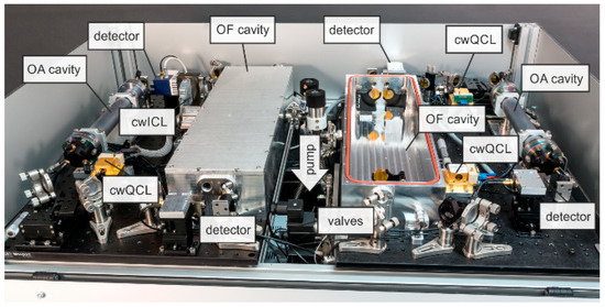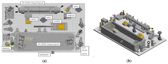 The modular design of the optical unit implemented in the RES-Q-Trace instrument is given in Figure 2. The dimensions of the optical unit are 113 × 79 × 13 cm3 comprising two mirrored optical platforms equipped with one OA-CEAS and one OF-CEAS measurement cell each. A detailed view of one such optical platform is given in Figure 3a,b exemplarily.