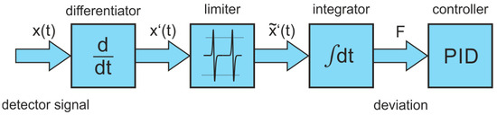 To maintain self-locking of the laser to the cavity resonances the optical feedback phase must be controlled actively. This is provided by controlling continuously the laser-to-cavity distance with the help of the above-mentioned PZT driven steering mirror in front of the cavity. As long as the ideal phase condition is not met, the transmitted signal of a cavity mode appears asymmetric because the laser locks to a frequency range, which is not centered on the peak of the cavity resonance. Therefore, an error signal is generated being proportional to the phase error, which is based on the median symmetry of the cavity modes in each recorded scan [18]. Using a LabVIEW (National Instruments, Austin, TX, USA) routine the detector signal is first differentiated point by point. Following a cutting of the signal at an experimentally determined level, the resulting values are integrated over the entire mode spectrum. This error signal is fed into a programmable PID control loop, which provides the flexibility to choose the P, I and D coefficients appropriately based on the experimental conditions. The output value of the PID control loop is scaled and converted to an analog voltage by a digital-to-analog converter on a slow multi-function DAQ board (National Instruments, Austin, TX, USA, PCI-6010) and fed into the PZT controller (Physik Instrumente, Karlsruhe, Germany, E-505.00) for maintaining phase-locking with a response time equal to the duration of a single scan. In Figure 4, the scheme of the software routine used for controlling the optical feedback is shown.
