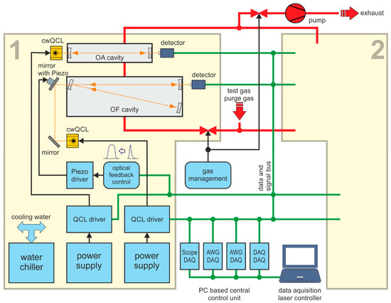 Scheme of the RES-Q-Trace system with OA- and OF-CEAS implementation, AWG—arbitrary waveform generator, DAQ—data acquisition board. The details are shown only for optical platform 1 (yellow box labeled with 1) as optical platform 2 (yellow box labeled with 2) is a mirrored setup of the first one.