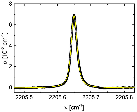 The reflectivity of the mirrors in the cavity was determined using a mixture of 5 ppm C3H6O diluted in N2 measuring the absorbance at different total pressures. According to Equation (1), from the linear regression the mean effective reflectivity was found to be 0.99938 ± 0.00001 resulting in a finesse of 5066 and an effective path length of about 518 m in this cavity. With the analysis of the CH4 transition at 1228.793 cm−1 measured in a sample of ambient air in the same pressure range as acetone, the reliability of these results could be confirmed assuming the concentration of CH4 in air in Greifswald is 1.8 ppm [17].