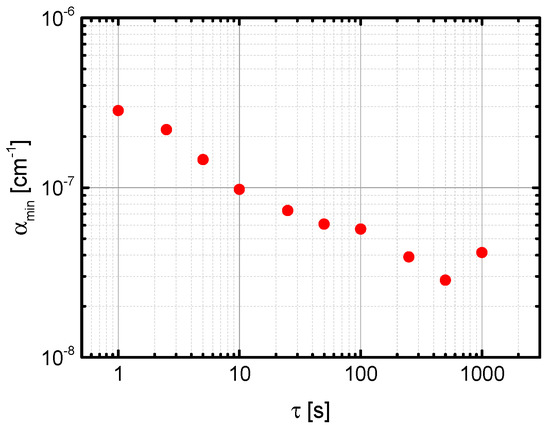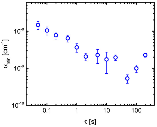 The sensitivity as well as the temporal stability of the OF-CEAS setup was characterized according to the method described in Section 2.3. Because of a distorted baseline by a sinusoidal structure (being visible in Figure 11), a background spectrum was measured and stored for the same number of scans and used for the calculation of α according to Equation (2) [22]. Such sinusoidal structured baselines are often observed in CEAS and CRDS when optical interference with parasitic reflections in the setup could not be minimized, e.g., [45,46]. In Figure 12, the mean value for αmin is plotted against the acquisition time τ whereas its standard deviation serves as an uncertainty for this value. The lowest value of αmin of (5.3 ± 0.1) × 10−10 cm−1 was obtained for 1000 averages recorded in 50 s. This corresponds to a minimum detectable concentration of 39 ppt of CH4 at atmospheric pressure [22].
