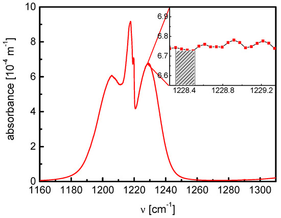 The capability to detect higher molecular species characterized by complex congested absorption spectra is demonstrated using acetone as an absorber in an OA-CEAS module of the RES-Q-Trace system. In Figure 8, a complex FTIR spectrum of 1 ppm·m−1 C3H6O from the Pacific Northwest National Laboratory (PNNL) IR database in the spectral range 1160 to 1260 cm−1 is presented [42]. The hatched area in the inset shows the spectral range from 1228.335–1228.508 cm−1 used for monitoring of C3H6O via OA-CEAS with a cw-QCL. From the PNNL data an effective absorption cross section of σ = 4.7 × 10−20 cm2 could be derived for this spectral range.
