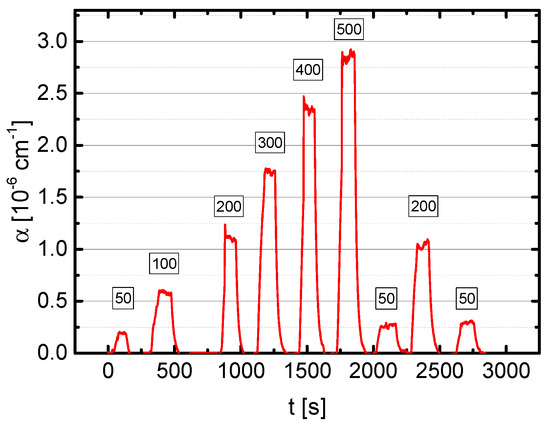 The resulting absorption coefficient of 5 ppm C3H6O diluted in N2 at 1228.4 cm−1 measured at different total pressures and at a tuning rate of the cw-QCL of 1000 Hz is shown in Figure 9. The minimal detectable absorption coefficient was found to be αmin = 3 × 10−8 cm−1. This value corresponds to a LOD of 10 pbb Hz−1/2 at atmospheric pressure.
