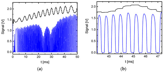Finally, the validation of the performance of the OF-CEAS modules is demonstrated by high sensitive detection of CH4. In Figure 10, a typical cavity transmission spectrum of CH4 at 1353 cm−1 averaged over 1000 scans of a sample at a pressure of 300 hPa with 300 ppb CH4 in N2, used as buffer gas, is presented [22]. For about 45 ms, the cw-QCL locked to about 100 successive cavity modes with a locking time of about 430 μs, which is much longer than the ring-down time of the cavity being typically below 10 μs. The time between single modes was in the range of 220 μs, see also the right panel in Figure 10.