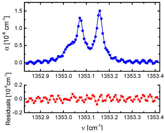 Upper panel: Absorption coefficient spectrum consisting of both even and odd modes of 300 ppb of CH4 in N2 as a buffer gas at a total pressure of 300 hPa together with a composite fit considering the 4 transitions of CH4 which contribute to the observed absorption feature. Lower panel: the residual of the fitted absorption profile; the standard deviation of the residual of this fit gives αmin = 3.35 × 10−8 cm−1 [22].