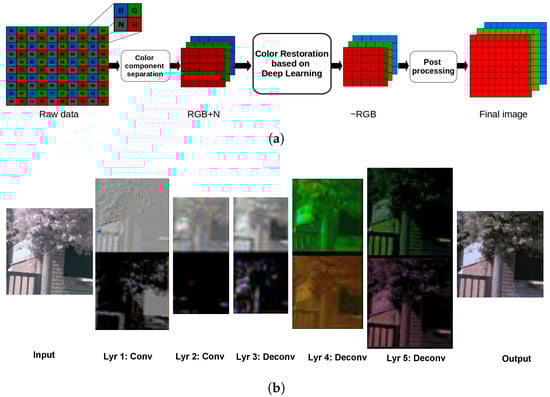 (a) Color restoration pipeline: the raw data corresponds to the information provided by the Single Sensor Camera (SSC); RGB+N represents the three channels affected by the NIR information which is referred to in the current work as X; ∼RGB is the restored color image, ; the final image is the result of the post-processing stage detailed in Section 3. (b) Visualization of convolutional and deconvolutional layers in ENDENet. Conv and Deconv refer to the convolutional and deconvolutional layers (Lyr: Layer).