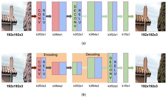 Illustration of the proposed deep learning architectures for RGB color restoration from multi-spectral images: (a) Convolutional and Deconvolutional Neural Network (CDNet) and (b) Encoder-Decoder Neural Network (ENDENet). CONV refers to convolution, DECONV to deconvolution and RELU (Rectified Linear Unit) is the non-linear function used for the layers in the respective illustration. For the term “k3f32s2”, k = kernel size (3 × 3), f = feature size (32) and s = size of stride (2, 2); the same notation is used through the illustration.