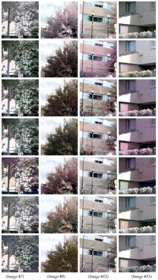is computed by transforming and Y to the CIELAB color space (, ); this color similarity measure is commonly used in the color research field, and it is a key evaluator to see the results of restoration in outdoor RGB+N images with vegetation, because, as mentioned in Section 1, the presence of NIR in vegetation desaturates the normal human color vision. For each pair of image pixels, is obtained as follows: