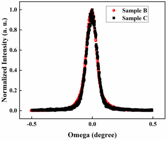 InN films were grown on sapphire substrates by plasma-assisted molecular beam epitaxy (PA-MBE). GaN layer with a thickness of 4 μm was grown first by metal-organic chemical vapor deposition (MOCVD) and was used as a template for InN growth. After regrowth of a 100-nm-thick GaN buffer layer on the GaN template, undoped and Mg-doped InN were directly grown on the GaN layer under slightly In-rich condition [27]. The typical thickness of InN is about 15 nm and the Mg cell temperature is varied from 220–280 °C during InN:Mg growth. Detailed sample parameters are listed in Table 1. The sheet resistance of as-grown InN and InN:Mg samples are extracted from Hall-effect measurement, which is also listed in Table 1. To confirm the quality of Mg-doped InN samples, X-ray diffraction (XRD) measurement on as-grown InN (sample C) and Mg-doped InN (sample B) was also performed. The XRD rocking curves of the two samples measured across (002) plane are shown in Figure 2 in which the FWHM of as-grown InN is 375 arcsec and the FWHM of Mg-doped InN is 363 arcsec. It is observed that the XRD rocking curves of the two samples measured across (002) plane are very close, indicating that the Mg doping does not significantly affect the crystal quality.
