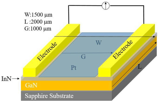 These samples were treated with HCl solution to remove indium droplets on the surface before device fabrication. The schematic structure of the hydrogen sensor is shown in Figure 3, where the device is comprised of a pair of Ohmic contact electrodes of Au/Al/Ti (50 nm/200 nm/50 nm) composite and a sensing window (1.0 mm in width 2.0 mm in length) defined by a 10-nm-thick Pt film between the electrodes on the InN surface. All metal films were deposited in an electron-beam evaporation system and patterned by a photolithographic liftoff process.