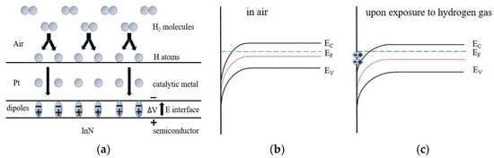 The model to explain the response to hydrogen exposure for Pt-semiconductor contact is based on the interaction between hydrogen-induced interface dipoles and two-dimensional electron gas (2DEG) in the semiconductor [28], which is already shown in Figure 4a. The atomic hydrogen dissociated through the catalytic action of Pt diffuses and then becomes being adsorbed at the Pt/semiconductor interfaces, inducing an interface dipole layer and thus leading to a modulation of the near-surface carrier concentration [28,29]. Figure 4b,c show the corresponding energy-band diagram of our sensors at equilibrium and under the introduction of hydrogen gas. Apparently, a barrier height modulation (decrease) at InN surface is observed once hydrogen gas is introduced. This change will cause the related modulation of two-dimensional electron gas (2DEG). Therefore, under the introduction of hydrogen gas, the change of electrical properties could be used to calibrate hydrogen concentration.