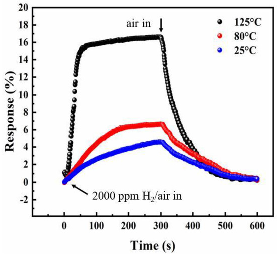 The resistance between the two electrodes was measured in response to hydrogen exposure at different temperatures (25 °C, 80 °C, and 150 °C) and at various H2 concentrations (100–2000 ppm H2/air). The hydrogen concentrations are modified by adjusting the ratio of the flow rates of two gas channels, i.e., hydrogen and synthetic air. Since the background resistance of each sensor is different from others, we define our response as resistance variation ratio: