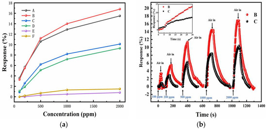 Then, the effect of Mg-doping on hydrogen sensing was characterized by measuring the response of the Mg-doped InN and as-grown InN sensors at 125 °C and at hydrogen concentration from 100 to 2000 ppm. The response of samples with different Mg cell temperatures and different gas atmospheres were shown in Figure 6a. According to previous reports and the sample growth conditions [31,32,33,34,35], there are three regions with increasing Mg cell temperature (TMg): Region I (TMg < 220 °C) and III (TMg > 260 °C) refers to the slightly-doped and overdoped regime, where the samples are n-type. Region II (220 °C < TMg < 260 °C) usually shows the evidence of p-type conduction in the bulk. It is observed that for samples A and B in Region II, their response is much higher than that of the sensor based on unintentionally doped InN, i.e., sample C. Especially under 2000 ppm H2/air at 125 °C, the response of sample B is about 16.8%, even 60% higher than that of sample C (10.1%). For sample D in the Region I, in which InN is lightly doped, its response is close to sample C, and when TMg is 280 °C, in Region III, the response of sample E only shows little response, even much lower than sample C. For sample F in Region II with a much larger thickness, it also has a weak response. Figure 6b shows the response curve of sample B and C, and the inset shows their transient response in first 30 s upon exposure to 2000 ppm H2/air, which is similar to the unintentionally doped InN sensor previously reported [18], almost linear with respect to time.