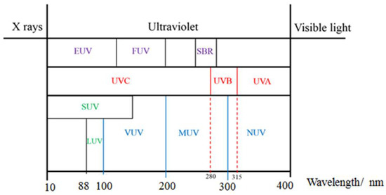 UV light is a general term for a specific band of electromagnetic radiation with a wavelength range of 100–400 nm and energy distribution range of 3.1–12.4 eV. Figure 1 shows the common classification of UV light, which can be divided into the following bands: UVA (400–315 nm), UVB (315–280 nm), UVC (280–200 nm), and VUV (200–10 nm) [5]. When solar UV radiation passes through the ozone layer, the 240–280 nm wavelengths are strongly absorbed. Hence, such radiation is almost non-existent in the atmosphere near the ground, and comprises the so-called solar-blind region (SBR) [6]. In the SBR, it is easy to detect a target signal, false alarms are rarely produced, and there is little background interference. For this reason, UV detection has an advantage over infrared and laser detection technology. UV radiation in the wavelength range of 300–400 nm has a high penetration rate and can reach the ground, so this radiation band is called the UV window to the atmosphere.