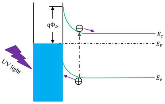 The Schottky structure is a common structure used in wide bandgap semiconductor UV detectors. It is a Schottky diode consisting of a semitransparent Schottky contact and an Ohmic contact [36]. The schematic structure of a Schottky photodetector is shown in Figure 3b and its operation is shown in Figure 5. The metal/semiconductor junctions exhibit rectifying behavior. The rectifying property of the metal-semiconductor contact arises from the presence of an electrostatic barrier between the metal and the semiconductor, which is attributed to the difference (q) in the work functions of the metal and semiconductor [37]. Zhao et al. [38] fabricated an asymmetric Schottky barrier UV detector based on an Ag/ZnO/Au structure, which exhibited excellent performance. The photocurrent generated from the device under UV illumination was about 120 nA without applying any external bias, and it also had a fast switching time of less than 30 ms. This phenomenon was explained by using Schottky barrier and O2 adsorption-desorption theories.