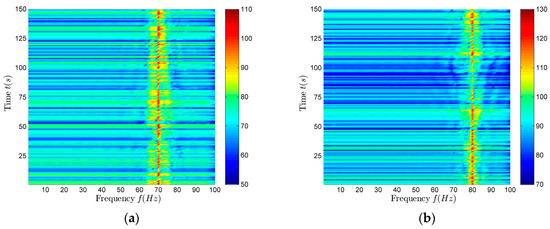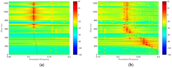 Figure 10 shows the time-frequency distribution in the frequency band where the first two line spectrums locate and the corresponding frequency sequence extraction results (dotted lines in black) of the first two line spectrums respectively.