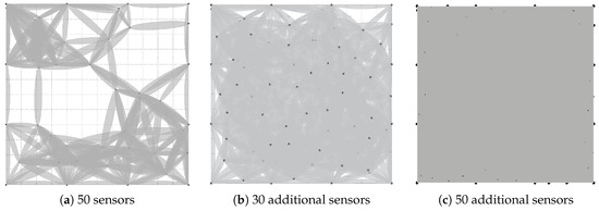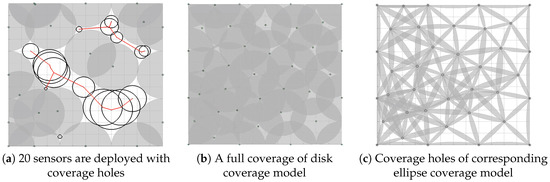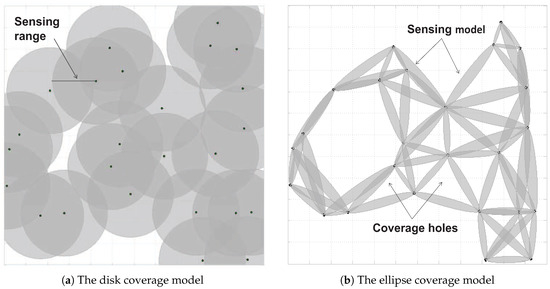 A large number of studies have been devoted to detecting and recovering coverage holes [2,3,4,5,6,7,8,9,10,11,12,13,14,15]. However, most existing approaches [2,3,4,5,6,7,8,9,16,17,18,19,20,21,22] are based on an assumption that the sensing range of a sensor node is like a disk (as shown in Figure 1a) with the centre of the disk as a sensor. Unfortunately, this assumption does not hold in many localization scenarios. For example, this assumption does not hold for a Radio Signal Strength Indicator (RSSI)-based localization application [23,24,25,26,27,28], whose task is to locate objects according to the disturbance of the objects to several communication links. This is because the coverage model of RSSI-based localization techniques is an ellipse [25] instead of a disk. This is illustrated in Figure 1b, in which the single gray range is the coverage model determined by a pair of sensor nodes, and the Euclidean distance of two sensor nodes is less than the transmission range of sensors. Due to the structural differences, existing coverage hole recovering methods based on the disk model is not applicable to RSSI-based location. This is because there still exist coverage holes for the ellipse coverage model, even though it is full coverage for the disk coverage model. As shown in Figure 1, a total of 25 sensor nodes are randomly deployed in a m region. Figure 1a,b show the total coverage regions based on the disc coverage model and the ellipse coverage model, respectively, and these sensor nodes have the exact same sensing range. Obviously, Figure 1b has more coverage holes than Figure 1a. More details will be dealt with in Section 6.2. Furthermore, compared to WSNs with the disk coverage model, WSNs with the ellipse coverage model are even more vulnerable to coverage holes due to the fact that the coverage model is determined by two sensors instead of one, and failure of any one of the two sensors could lead to coverage holes.