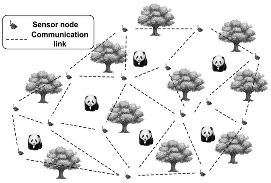 Illustration of RSSI-based localization techniques. A number of sensors are deployed in advance in the activity area of giant pandas in a wildlife park, and giant pandas are the objects of interest. These sensors continuously transmit packets and measure the RSSI value of the corresponding communication links. When pandas are present, additional communication links will be introduced between sensors (this is also referred as the multi-path effects). As a result, the RSSI value will be considerably changed. Combined with the related algorithms, the locations of giant pandas can be estimated.