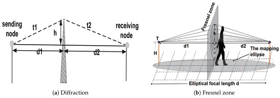 According to Chen Liu et al. [36], Fresnel zones can be introduced to model the phenomenon of diffraction. In geometry, Fresnel zone is a series of concentric circles consists of different ellipsoids. As shown in Figure 3b, for any cross section s, from inside to outside of the concentric circle, it can be defined as the 1st, 2nd, 3rd, …, nth Fresnel zone in turn. Thus, radius of the nth Fresnel zone can be obtained by Equation (1), where and are the distance from the cross section of the Fresnel zone to the sending node and the receiving node respectively, and is the wavelength of the electromagnetic wave. In terms of the diffraction theory [41], propagation of the electromagnetic wave is mainly completed in the first Fresnel zone. Therefore, as long as the first Fresnel zone is not blocked, it can be thought that RSSI value between two sensor nodes is not affected.