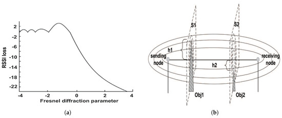 Fresnel diffraction. (a) Relationships between diffraction parameter v and RSSI loss. When , RSSI loss is almost zero. This means that the obstacle hardly has any effect on the RSSI value when it does not affect the first Fresnel zone. (b) The impact of different obstacles. and are two obstacles, whose relative height to the sensor nodes is and , respectively, and is a negative number.