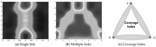 We conducted experiments in an outdoor environment and analyzed coverage models for scenarios of a single link and multiple links, respectively. Figure 5 summarizes the results (detailed discussions are given in Section 6.1). Figure 5a shows the result of a single link, and the different gray scales stand for different changes of RSSI values. The result shows that the changes in RSSI values are negligible when the person stands in a cell more than a certain distance away from the connection line of two sensors. Furthermore, it also proves that the ellipse can be used as a coverage model of RSSI-based localization techniques. Figure 5b shows the result of multiple links. Similarly, the different gray scales stand for different changes in RSSI values. Thus, the regions in the centre of the three sensors are the coverage holes. Figure 5c shows the coverage holes in theory. Obviously, coverage holes in theory and experiment are similar.