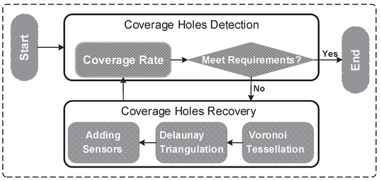 In this section, we propose an algorithm to detect and recover coverage holes. Firstly, coverage holes are detected by calculating the coverage rate. We believe that there are coverage holes as long as the coverage rate does not meet the requirement of the corresponding application. We then recover coverage holes by deploying additional sensors. Deployment locations of the additional sensors are determined by Voronoi tessellation and Delaunay triangulation. Figure 6 shows the implementation of the algorithm.
