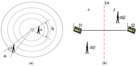 Voronoi tessellation. (a) The influence of distance. A and B are two device-free objects with an approximately equal size, and the gray dot denotes a sensor node. (b) The theory of Voronoi tessellation. and are two sensor nodes that can communicate with each other, is the perpendicular bisector of and divides the plane into two regions. For any object in , the Euclidean distance from it to is smaller than it is to in terms of the mid-perpendicular theorem.