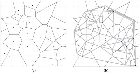 Voronoi tessellation (a) and Delaunay triangulation (b).