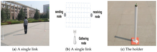 Experimental deployment. (a) The experimental deployment when there is only one link. (b) The partition of regions when there is a single link. (c) The holder for reducing the influence of the ground.