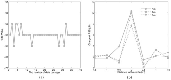 Firstly, two sensors with 4 m distance intervals are deployed in an empty region, as shown in Figure 9a. In order to reduce the influence of the ground, sensors are put in a holder and the height of the holder is m, as shown in Figure 9c. Then, as shown in Figure 9b, regions between two sensors are equally divided into 40 small cells with a size of m. We firstly collect RSSI values when there are no obstacles between two sensors. Figure 10a shows the result. The RSSI values are approximately dB, and there are approximately 1 dB fluctuations when there are no obstacles between two sensors. Therefore, we believe that the object cannot be tracked and monitored when the changes of the RSSI values are less than 1 dB. Then we collect RSSI values when a person stands in different cells. The height of the person is m, and s/he covers about m. The result is shown in Figure 5a, and the different gray scales stand for different changes in RSSI values. Next, we verify the influence of different distance intervals. Figure 10b shows the changes of RSSI values at distance intervals of 4, 6, and 8 m, respectively. The results show that the distance interval does not affect the ellipse coverage model between two sensors when the interval is within a certain range.
