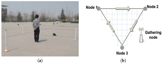 As shown in Figure 11a, three sensors are deployed with a distance interval of 4 m in a region and sensors communicate with each other. The regions inside the three sensors are equally divided into 34 small cells with a size of m, as shown in Figure 11b. We firstly collect the RSSI values of three communication links when there are no obstacles, denoted as . Then we collect RSSI values of three communication links when a person with a height of m and covering an area of m stands in different cells. Forty RSSI values are recorded for every cell. Let denote the RSSI values of cell i, where , , and are the mean values of 40 records of three communication links, respectively. Let denote the change in RSSI values of cell i and . In particular, when , this cell is marked as a covered region. This is because there are approximately 1 dB fluctuations when there are no obstacles. The result is shown in Figure 5b, and the different gray scales stand for different changes in RSSI values.