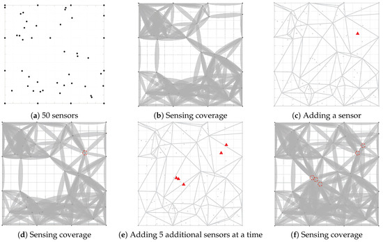 Figure 15 shows the operational process of our algorithm. As shown in Figure 15a, 50 sensor nodes are randomly deployed in the target regions. The sensing coverage of these sensors is shown in Figure 15b. The coverage rate can be calculated as 30.29%. Figure 15c shows the position of the additional sensor (i.e., the red triangle), and Figure 15d shows the sensing coverage of the regions. Of course, multiple sensor nodes can be added at the same time according to our algorithm. Figure 15e,f show the position of five additional sensor nodes and shows the coverage when five sensor nodes are added. Thus, multiple sensor nodes can be added at a time when the coverage rate is relatively low.