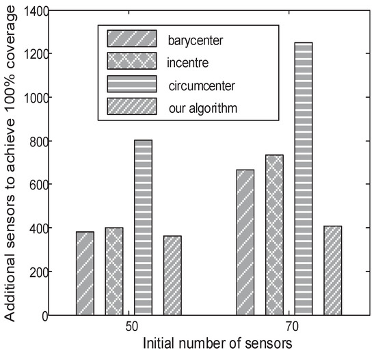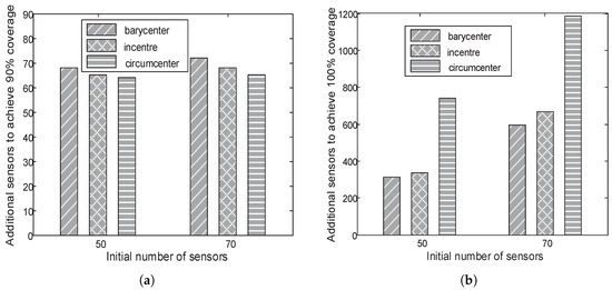 Figure 17a shows the number of new sensors to achieve 90% coverage when additional sensors are deployed in different locations (i.e., the barycentre, the in-centre, and the circum-centre) of the Delaunay triangle with the largest area. As shown in Figure 17a, when an additional sensor is deployed in the circum-centre of the Delaunay triangle with the largest area, a minimum number of new sensors are needed. Figure 17b shows the number of new sensors to achieve 100% coverage when the current coverage rate is larger than 90%. Obviously, when the additional sensors are deployed in the barycentre of the Delaunay triangle with the largest area, a minimum number of new sensors is needed. Thus, we enhance the method of [46] by deploying the additional sensors in the circum-centre of the Delaunay triangle when the current coverage rate is less than 90% and by deploying the additional sensors in the barycentre of the Delaunay triangle when the current coverage rate is between 90 and 100%. The reason we use the threshold of 90% is shown in Appendix A. Figure 18 shows that our method needs a minimum number of new sensors to achieve 100% coverage. When 50 and 70 sensors are initially deployed in the target regions, our method needs 362 and 409 new sensors, respectively, to achieve 100% coverage, and the method in [46] needs 382 and 664 new sensors, respectively, to achieve 100% coverage. Obviously, our method can recover coverage holes with the minimum number of new sensors.