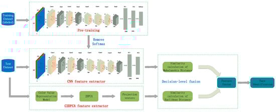 The face recognition method using a C2D-CNN model under decision-level fusion is divided into three parts: feature extraction for CNN, feature extraction for color 2DPCA, and decision-level fusion. The algorithm flow is shown in Figure 1.