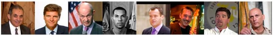 In this paper, the LFW face database [] and FRGC v2.0 face database [] were selected for experiments to evaluate the face recognition algorithm proposed in this paper. The LFW database contains 13,233 face images collected from the Internet, among them, there are 1680 persons have two or more images and 4096 people have only one image. LFW is mainly used for research on face recognition under unrestricted conditions and has become the benchmark for academic evaluation of recognition performance. It can fully reflect the changes of face in real conditions, such as illumination, gesture, expression, background, gender etc. Figure 6 shows some of the pictures in the LFW database.